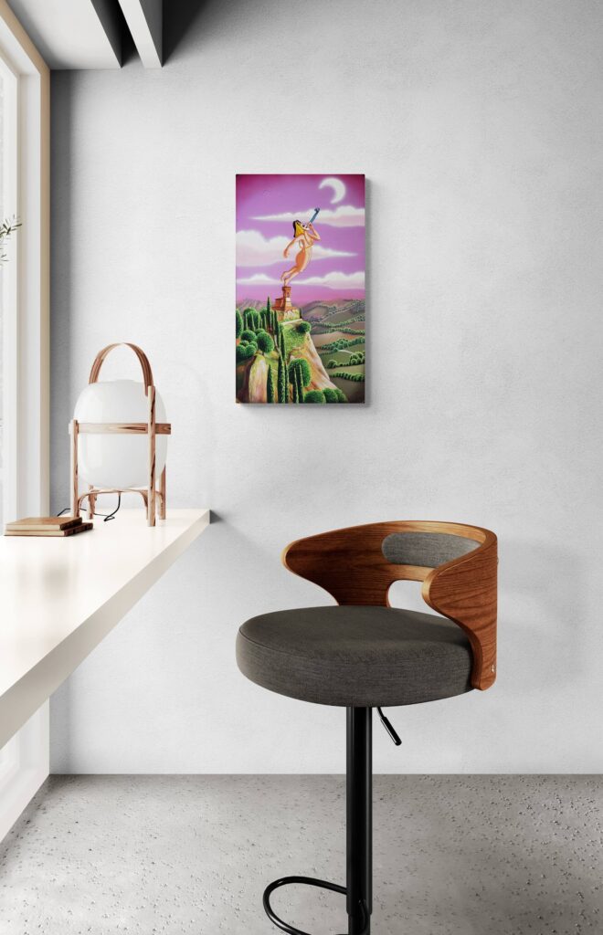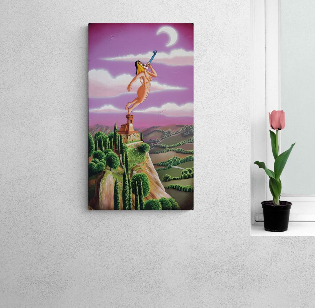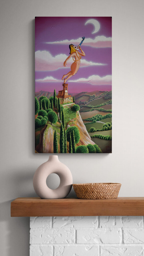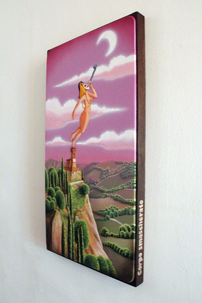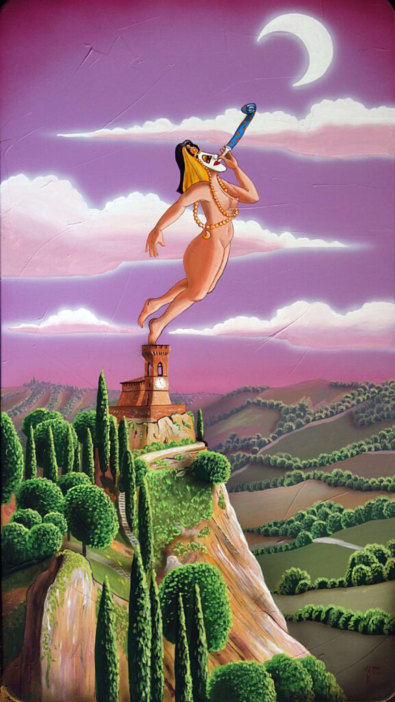 “Un giorno mia moglie ed io decidemmo di andare a visitare un paesino non lontano da Firenze al confine fra Toscana e Romagna. Con tutte le limitazioni dovute alla pandemia prendemmo il trenino che sale sull’Appennino. Arrivammo così a Brisighella, girammo per il paese e iniziammo a salire sulla montagnola che lo sovrasta dove c’è la torre dell’orologio. Una fatica immensa, non so quanti scalini ripidi e salite che abbiamo fatto. Ma alla fine la cima era nostra. Arrivati su naturalmente non eravamo soli. Infatti c’erano delle persone che discutevano se fare o no una festa in costume lassù per un evento folcloristico. Ecco, mi sono immaginato la tipa che aveva già un abbigliamento diciamo molto curioso, per opposto “vestirsi” completamente nuda, per sfidare la luna.”