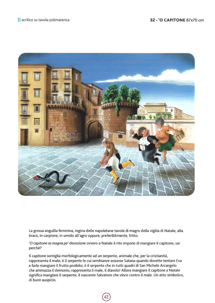 Il numero 32 nella Smorfia napoletana è rappresentato dal ‘capitone’, ovvero l’anguilla femmina. Il ‘capitone’ è un piatto tipico napoletano solitamente servito la Vigilia di Natale cucinato in diversi modi. Secondo la tradizione, a Natale il ‘capitone’ deve essere assolutamente presente perché è molto simile al serpente simbolo del male, quindi mangiare il capitone significa sconfiggere il diavolo e il male. Questa usanza ha avuto anche un uso pratico in passato, in quanto il ‘capitone’ è un pesce molto economico e accessibile anche alle persone più povere.