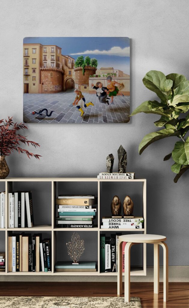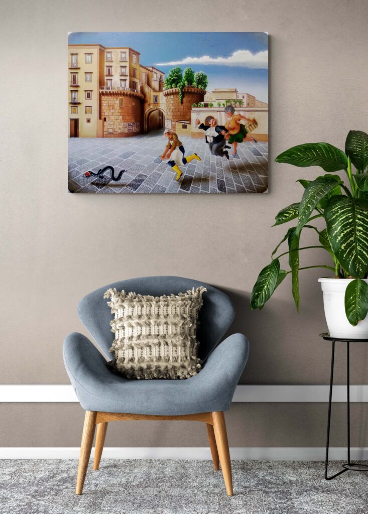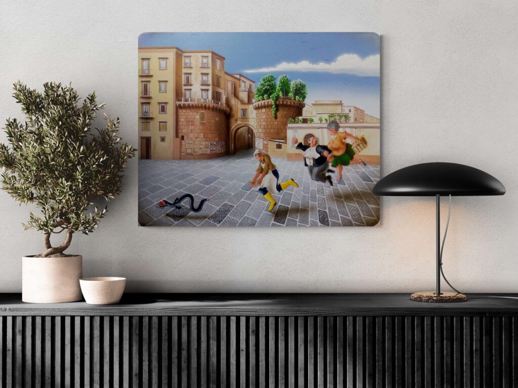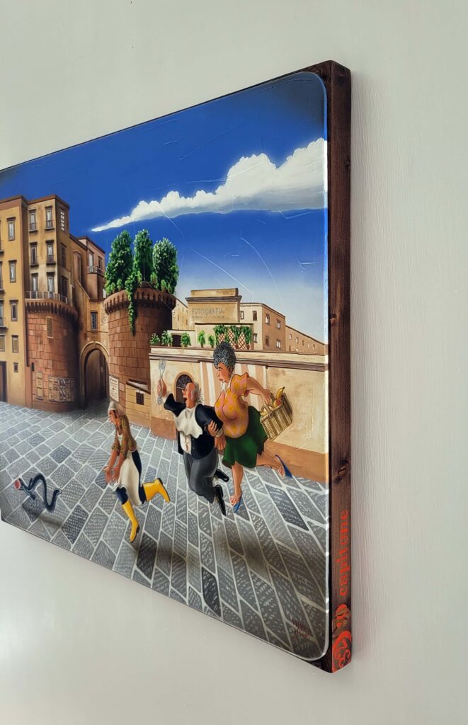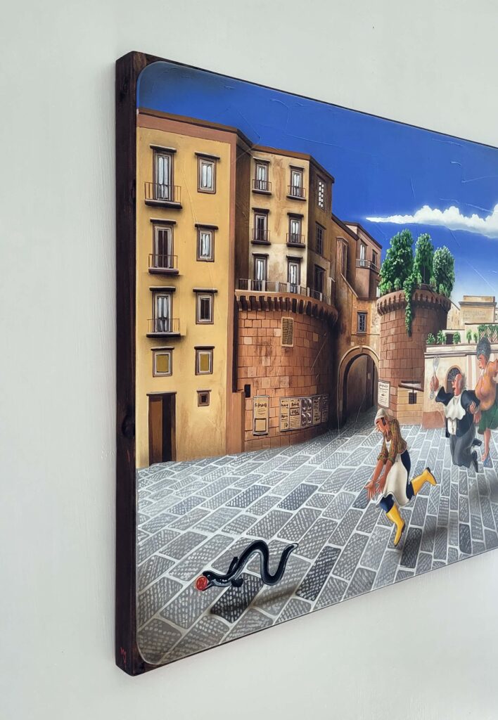 La serie ‘A Tumbulella’, Il Bingo Napoletano, è composta da un gruppo di 90 opere ispirate ai numeri della Smorfia, uno straordinario viaggio attraverso una Napoli colorata che viene vissuta dall’artista come “un teatro a cielo aperto”.