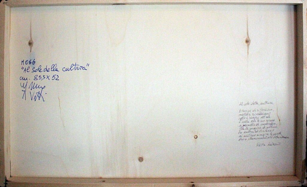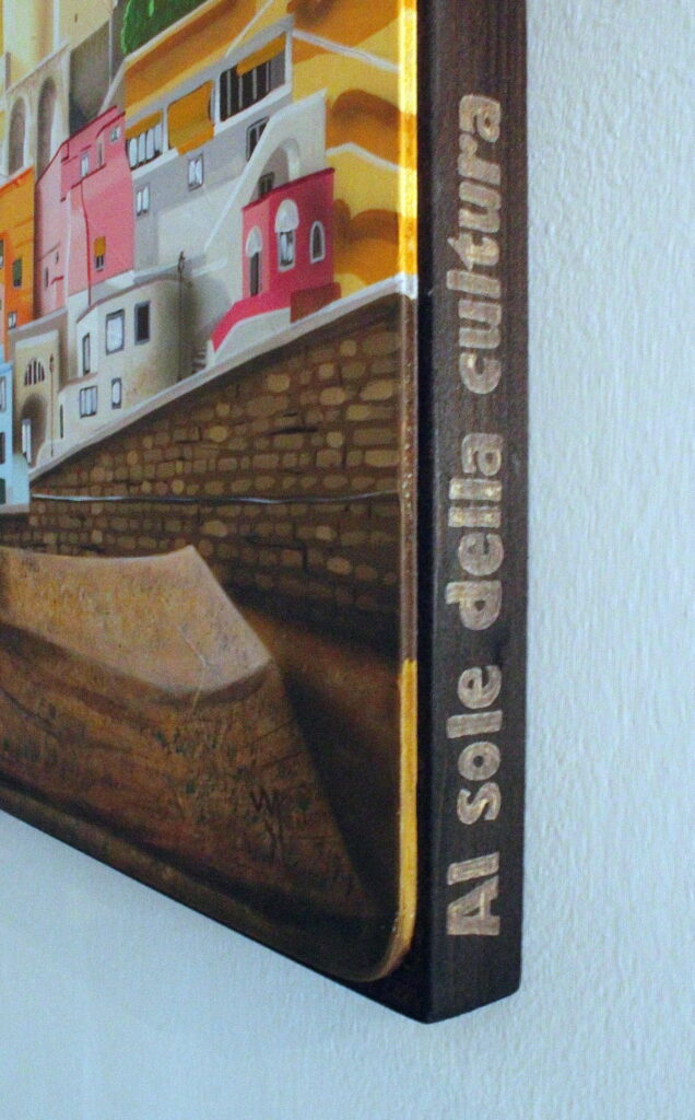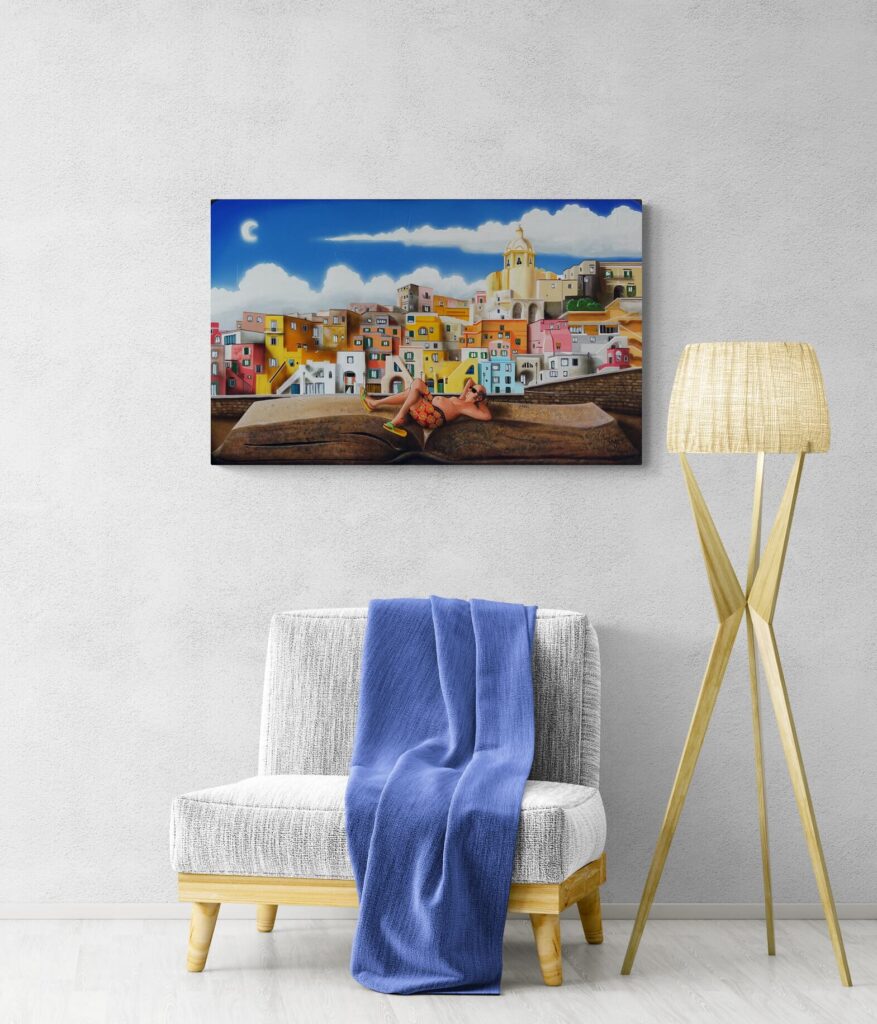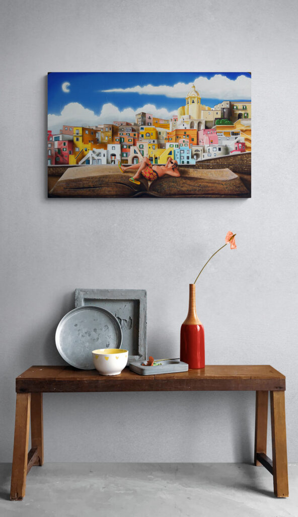 “Quando, fu deciso che Procida diventasse la capitale italiana della cultura decisi di fare questo quadro. Una delle tipicità dell’italiano che non legge mai un libro, ma sulla spiaggia, sotto l’ombrellone, non si esime dal tenere in mano un libro. Penso facendo finta, ma questa forse è una mia malignità.”