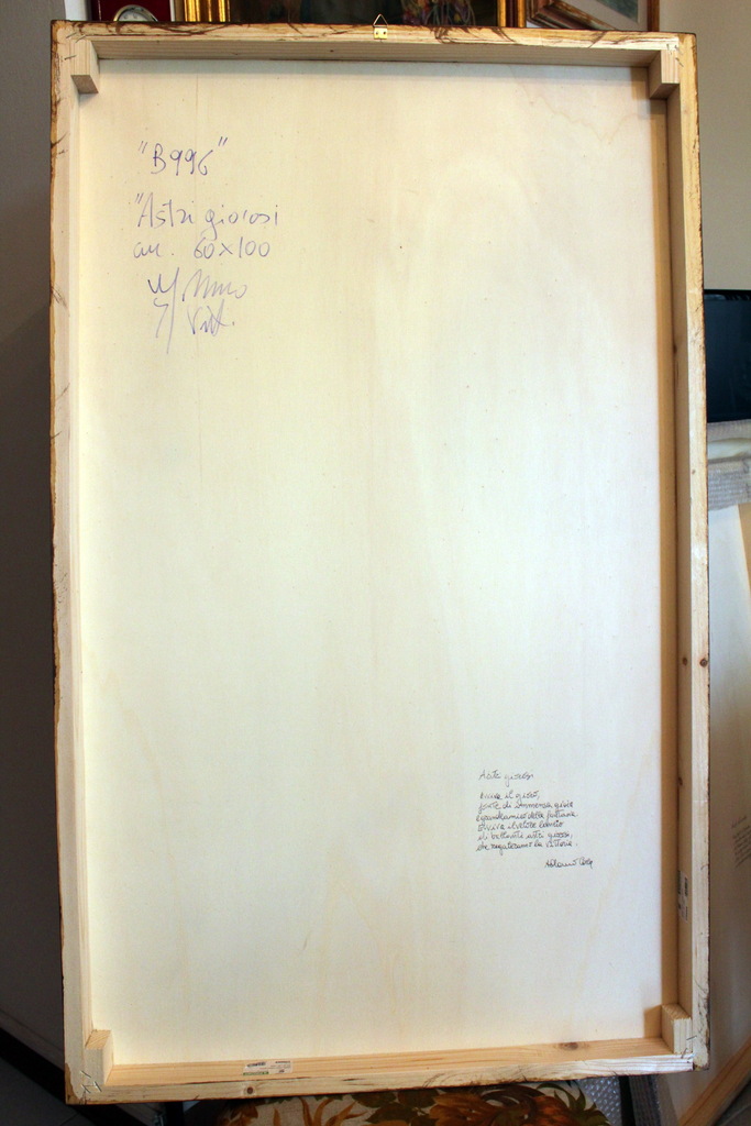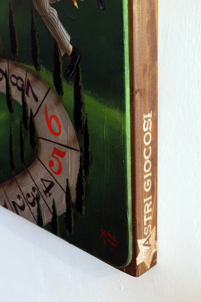 “Camminando un giorno con amici per le Crete senesi seguendo una delle innumerevoli strade bianche, ci trovammo davanti una strada talmente tortuosa che sembrava intrecciarsi. Sembrava proprio una tavola del gioco dell’oca. Quella sensazione da me provata finì subito nel mio blocco che porto sempre con me, e rimase lì per tanto tempo…. diversi tentativi di farla diventare quadro, finché un giorno nacque questo quadro ambientandola però nella vicina Val d’Orcia in provincia di Siena.”