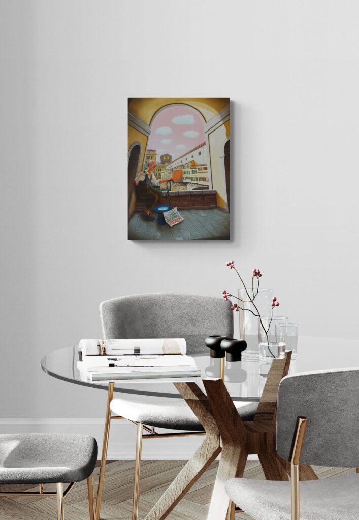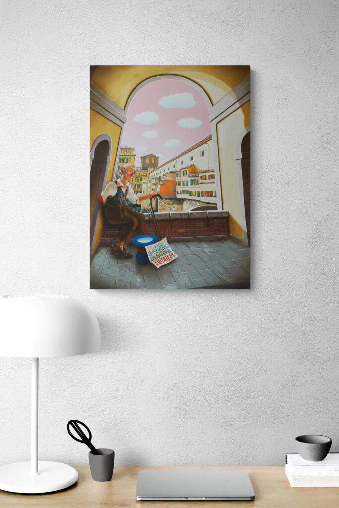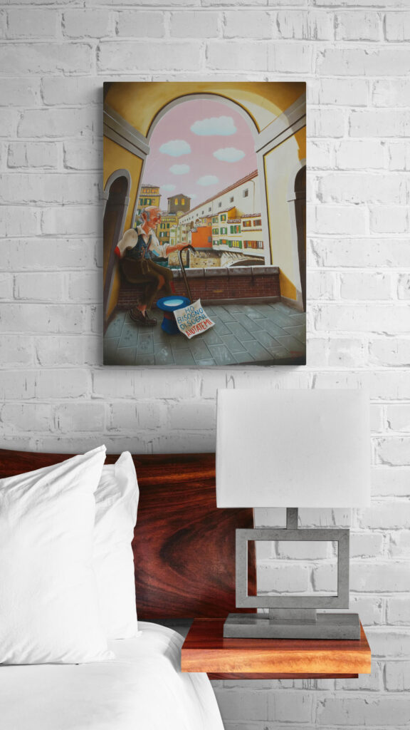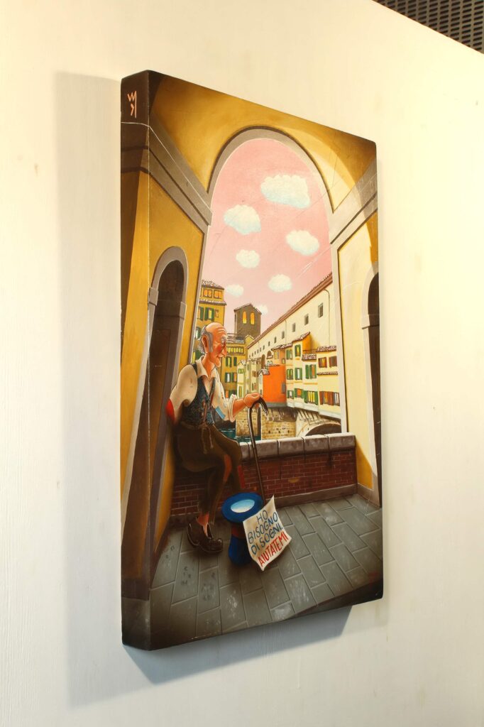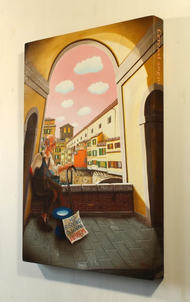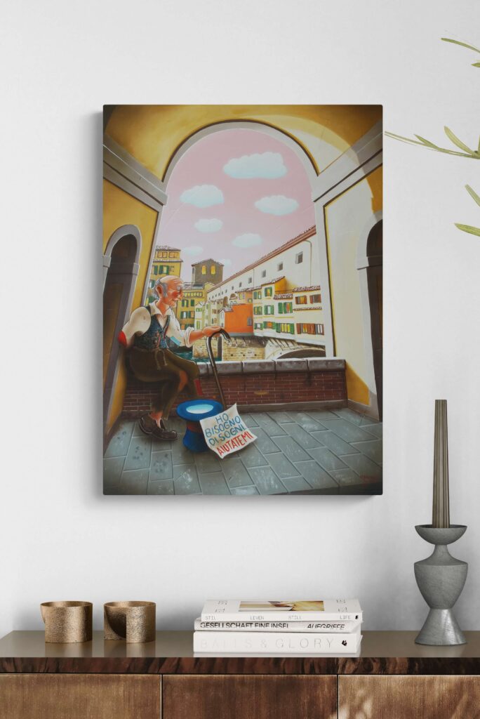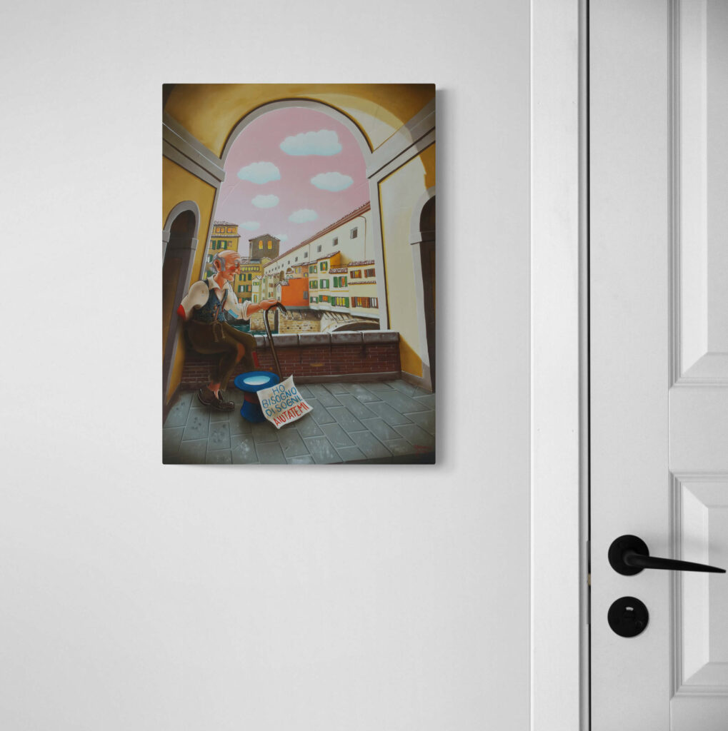 Quest’opera fa parte della collezione Nuove Prospettive del Surrealismo, il nuovo progetto espositivo di Maurizio Vinanti. In questo ciclo, l’artista abbandona la prospettiva tradizionale per esplorare un linguaggio visivo personale e inedito, in cui ogni quadro rappresenta una tappa di un viaggio di trasformazione, ricerca e libertà espressiva.