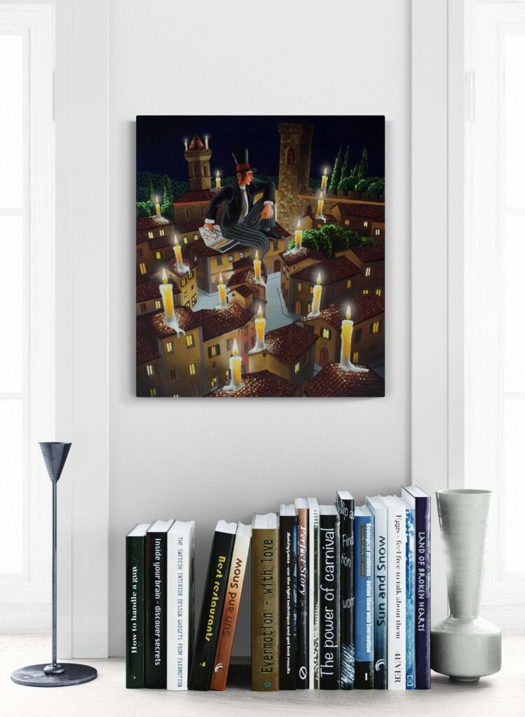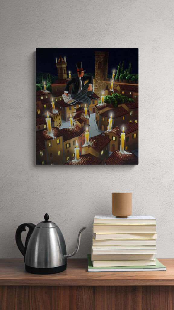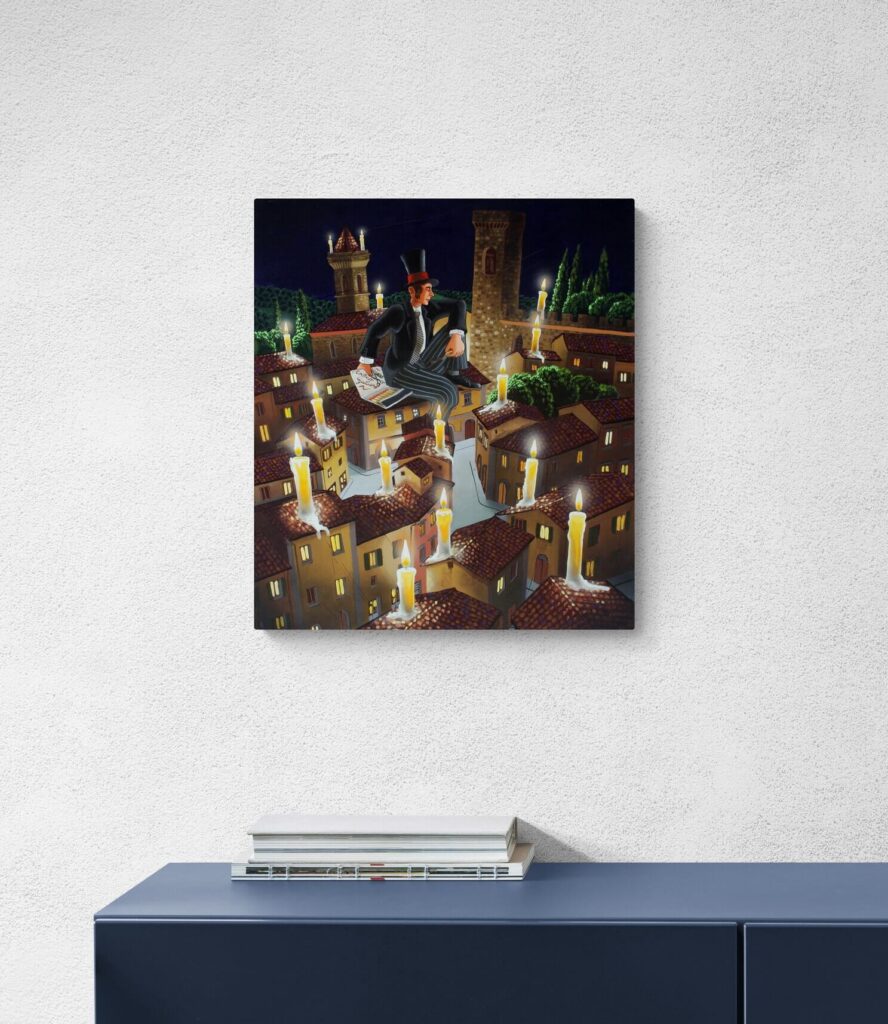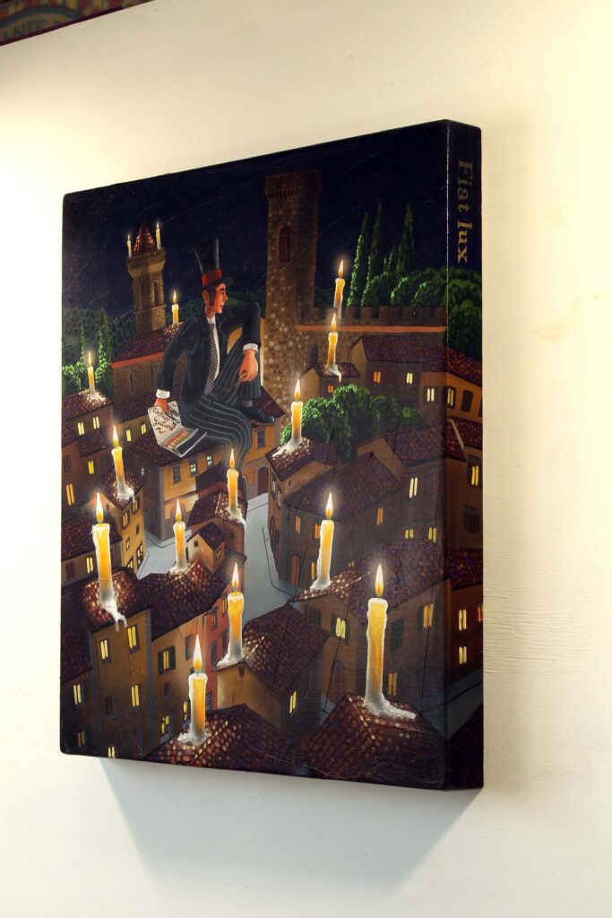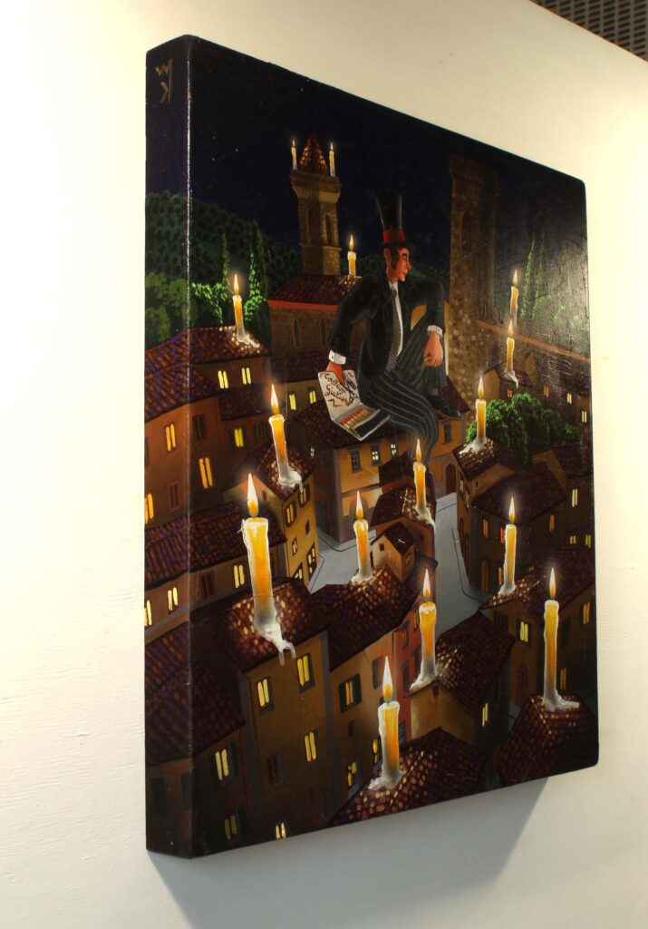 Nel quadro, per accendere le candele, non bastano accendini anonimi: servono i cerini profumati, proprio quelli che mio padre regalava ai suoi clienti a Natale, nel suo negozio da barbiere. O magari… anche quei cerini un po’ birichini, capaci di far sorridere la notte.