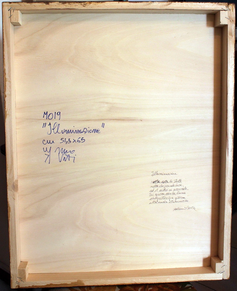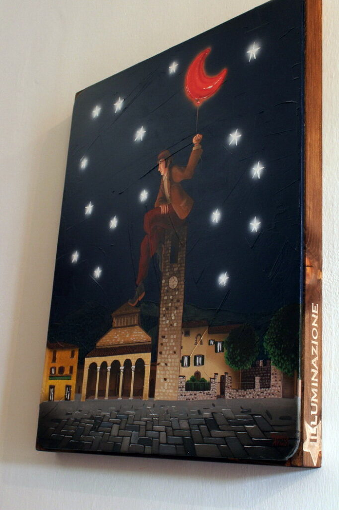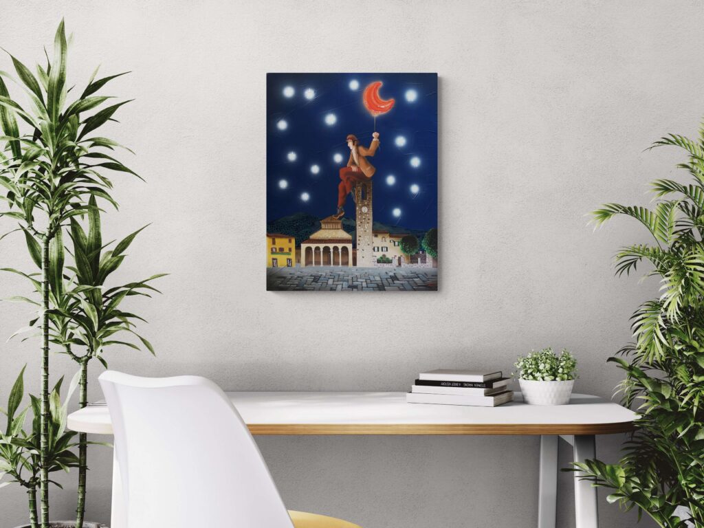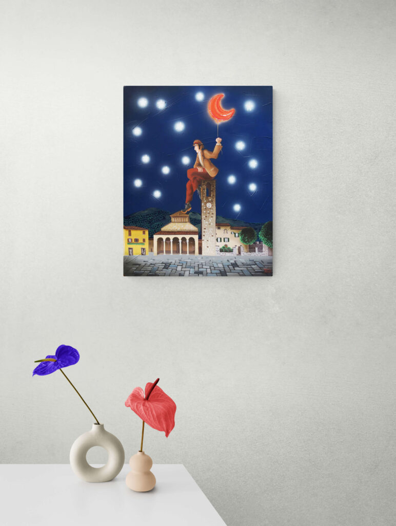 “Una sera, dopo cena a Reggello, decidemmo di fare un giro verso Cascia, dove si trova una delle pievi più belle e antiche d’Italia. Fuori dalla chiesa, il prete e un gruppo di paesani sfuggivano al caldo, seduti sulla piazzetta su sedie portate da casa, chiacchierando amabilmente. Grazie a un amico che era con noi, il prete ci aprì il museo di Masaccio per farcelo visitare. È stata un’esperienza spettacolare, e all’uscita ci ha accolto una luna rossa magnifica. Quella sera è rimasta impressa nella mia mente per lungo tempo, fino a quando un giorno si è trasformata nel quadro che vedete oggi.”