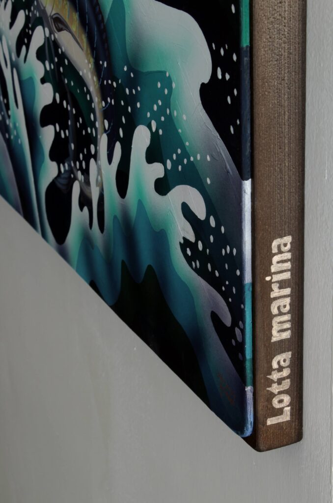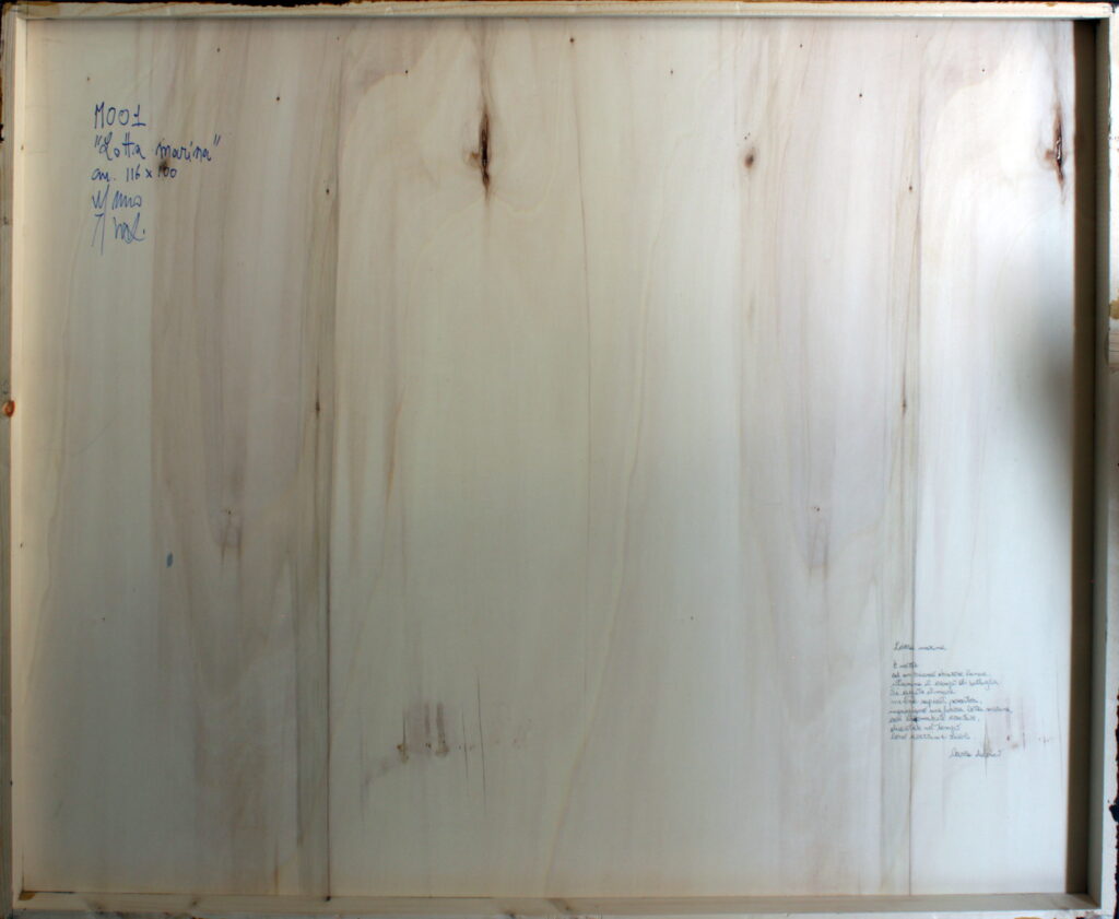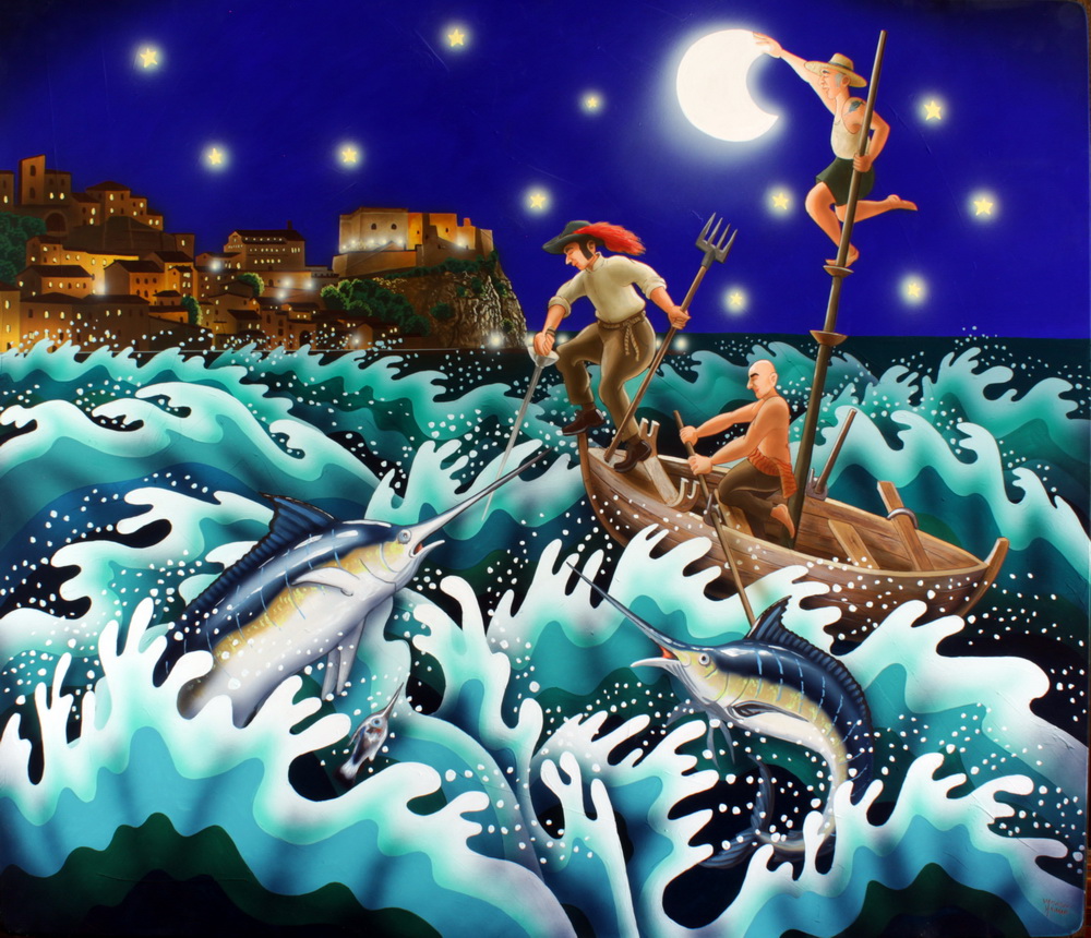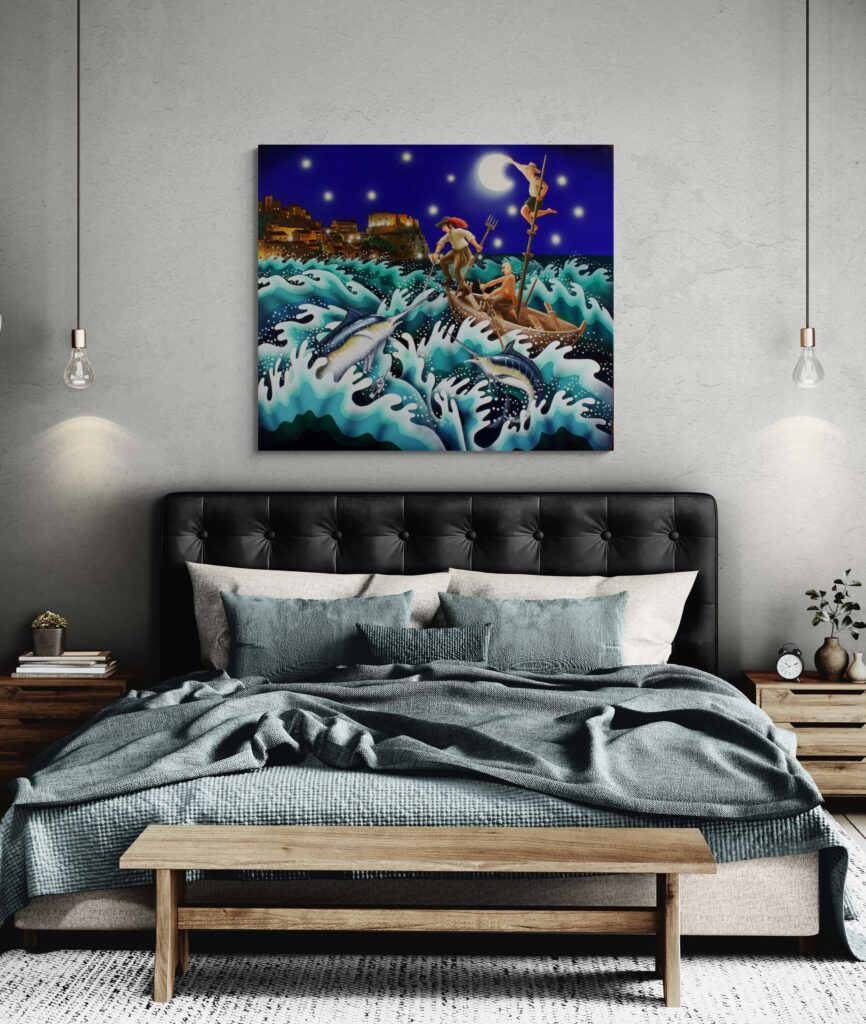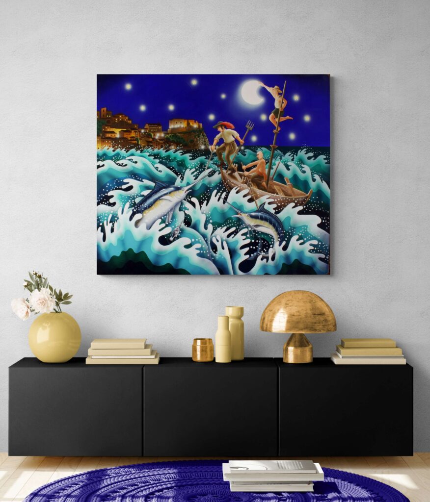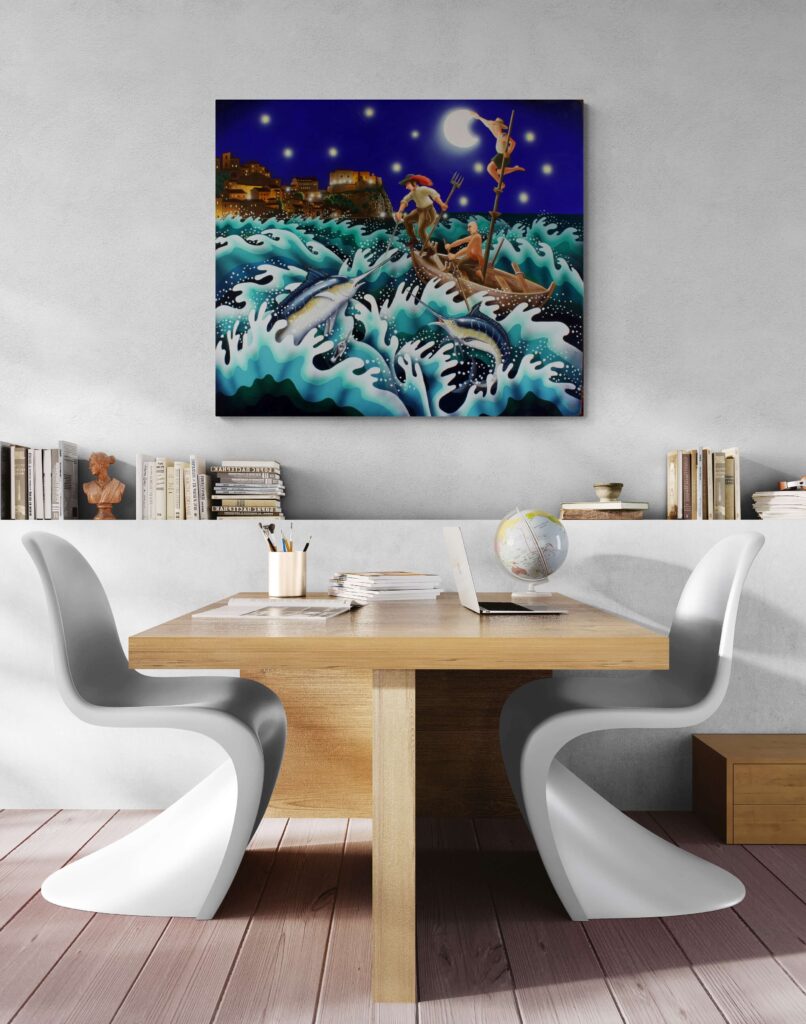 “Affascinato dalla canzone di Modugno sulla caccia al pesce spada e da tutti i rituali legati alla pesca, quella scena si è impressa profondamente nella mia mente, fino ai recessi più remoti dei miei pensieri. Anni fa ho già tentato di rappresentarla, ottenendo risultati soddisfacenti, ma sentivo il bisogno di ridipingerla con nuove suggestioni e dinamiche. Ho scelto di ambientare questa nuova opera in uno dei luoghi simbolo di questa speciale pesca: lo stretto di Messina, di fronte al pittoresco paese di Scilla. Questi sono tra i tratti più pericolosi del Mediterraneo, dove il mito di Scilla e il vicino Cariddi hanno terrorizzato marinai di tutto il mondo per secoli. Questa nuova interpretazione non si limita a raffigurare la bellezza e la maestosità di questa caccia marina, ma cerca di catturare anche la tensione e la grandiosità dell’ambiente. È un tributo alla tradizione marinara e al coraggio dei pescatori che affrontano le forze imprevedibili del mare, incarnate in queste leggendarie figure mitologiche.”