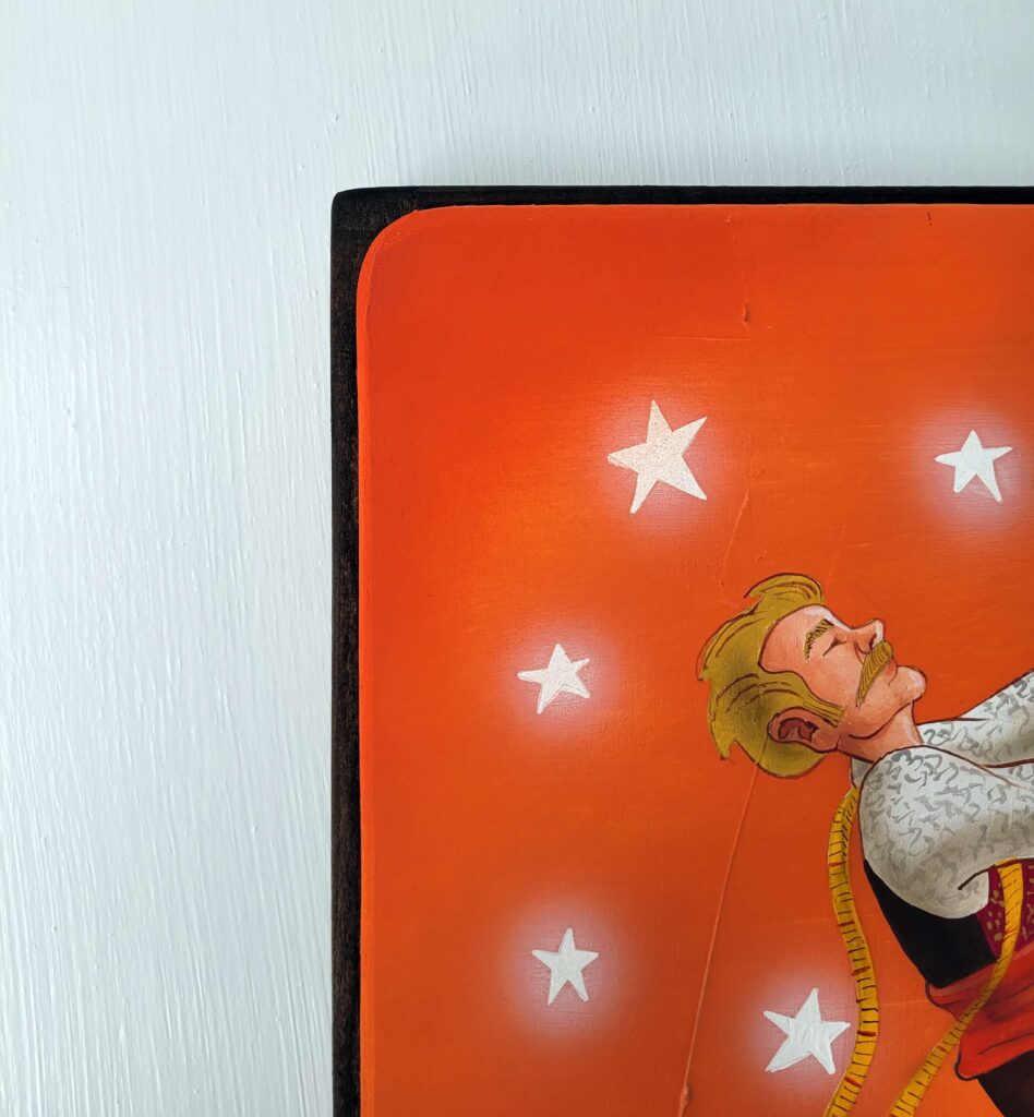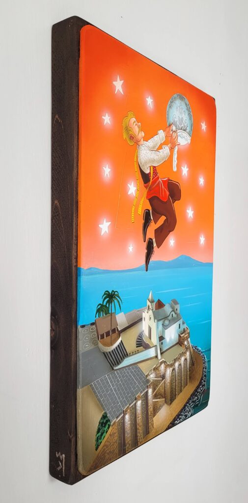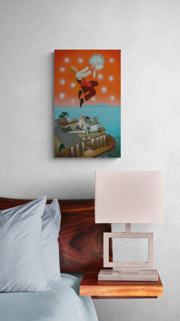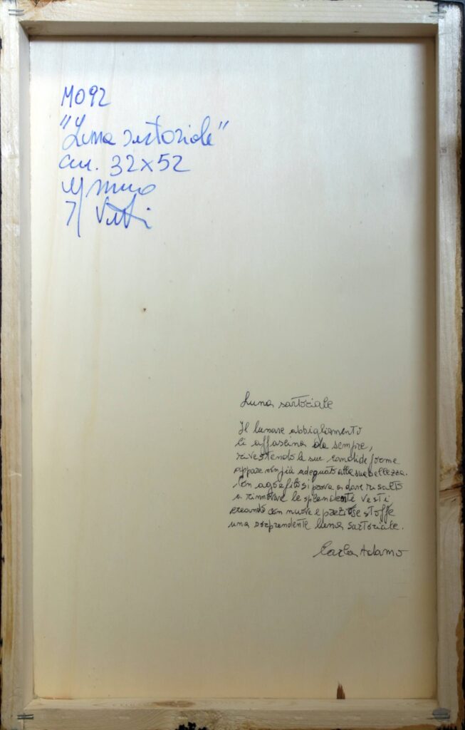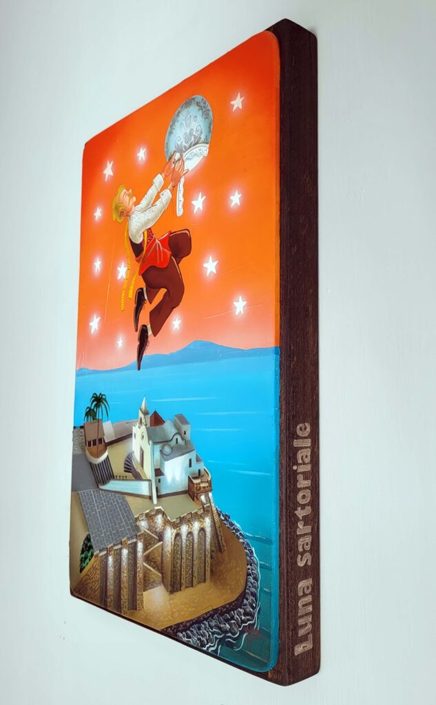 “L’ispirazione di un sarto che riveste la luna con un tessuto damascato mi è venuta anni fa, quando un’amica si era presa la mania di decorare palline di polistirolo per Natale. L’idea è rimasta fra le oltre 500 annotazioni nei miei taccuini e fra gli schizzi su fogli di ogni tipo, senza mai diventare un quadro. Durante una delle mie visite a Ischia, ho fotografato la chiesa della Madonna del Soccorso, che mi ha affascinato profondamente tanto da ispirarmi un quadro. Ma quella chiesa, così ricca di fascino e magia, ha improvvisamente incontrato nella mia mente la pallina rivestita di damasco che si è trasformata nella luna. Questo strano connubio di immagini non ha una spiegazione razionale, ma se ci fosse, non sarei un surrealista. Quest’opera riflette la fusione di suggestioni e visioni che mi hanno accompagnato in un viaggio creativo, dove la realtà si mescola con il fantastico, trasformando oggetti e luoghi comuni in simboli di un mondo al di là della nostra percezione ordinaria.”
