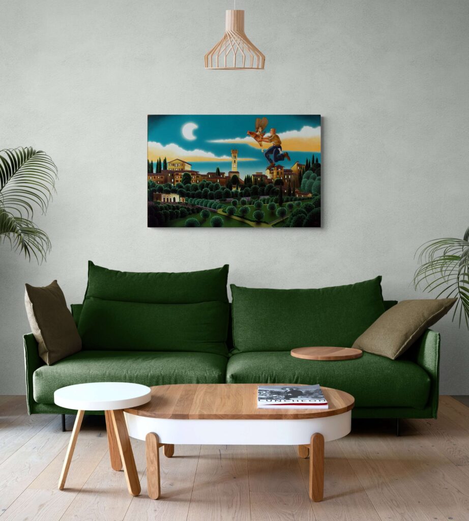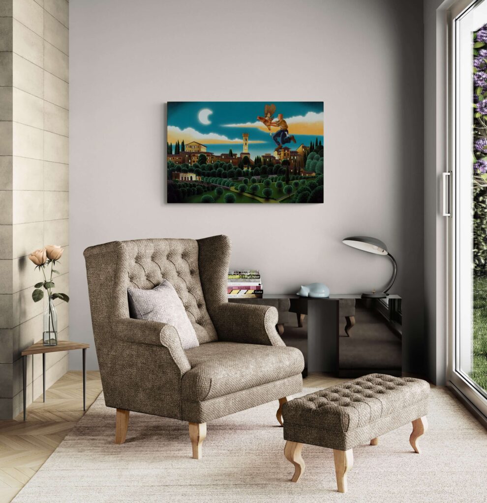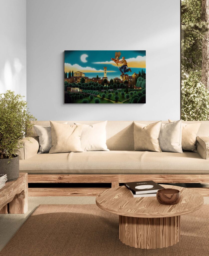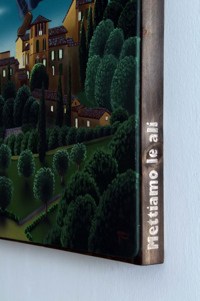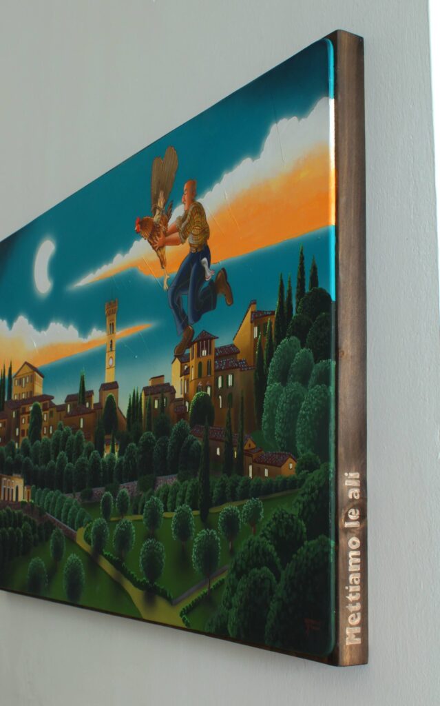 “Questa opera è, in realtà, una sorta di scherzo. Fiesole è il borgo collinare che ha dato vita alla città di Firenze ed è anche il luogo dove io e Carla, mia moglie, ci siamo incontrati da bambini. Nel corso degli anni abbiamo conosciuto molte persone, ma ce n’è stata una in particolare che sembrava così piena di sé da sembrare pronta a spiccare il volo da terra… Quest’opera è dedicata a lei.”