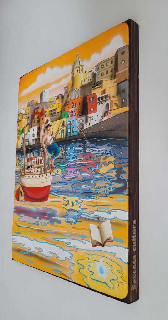 “Anche questo dipinto all’indomani dell’assegnazione di Capitale italiana della cultura. Un paese di pescatori che nelle sue reti (o in questo caso nelle canne da pesca) ha trovato la sua cultura”